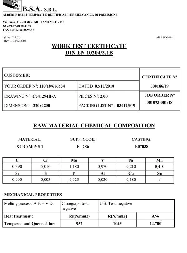 Ogni singolo pezzo è identificato dalla marcatura “BSA” che è marchio di qualità per i nostri clienti e che garantisce il 100% di tracciabilità del lotto di produzione. Un certificato di controllo e qualità viene rilasciato al cliente al termine della lavorazione contenente tutte le informazioni rilevanti sulla conformità del prodotto.